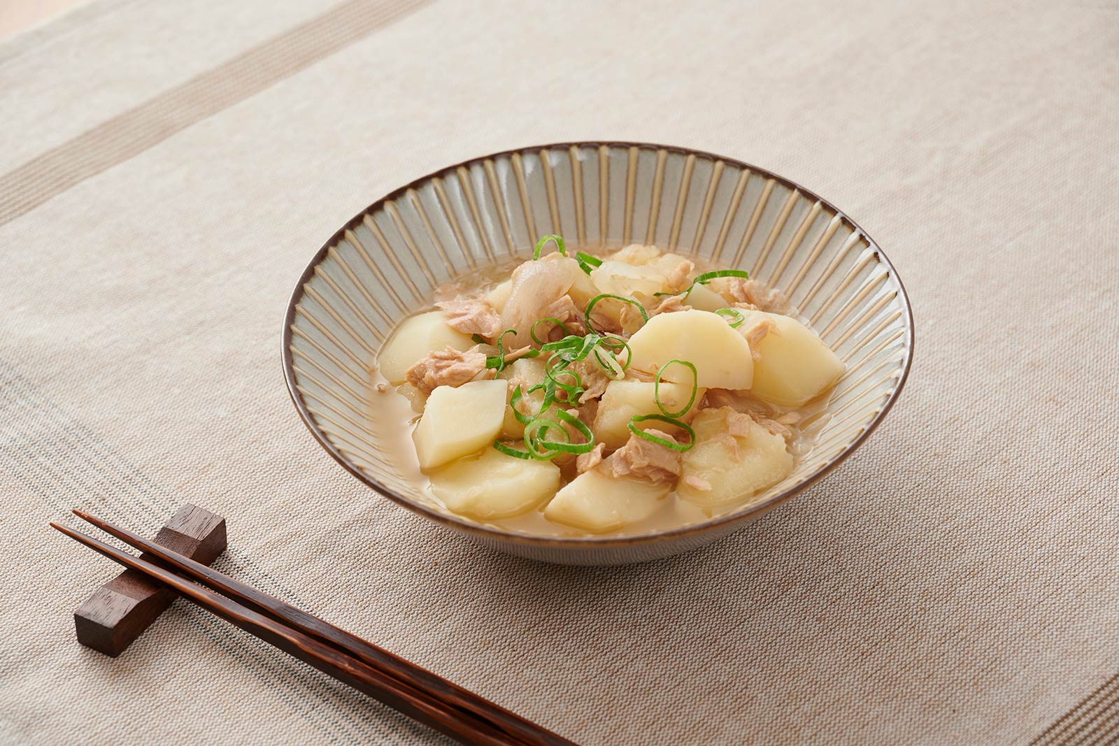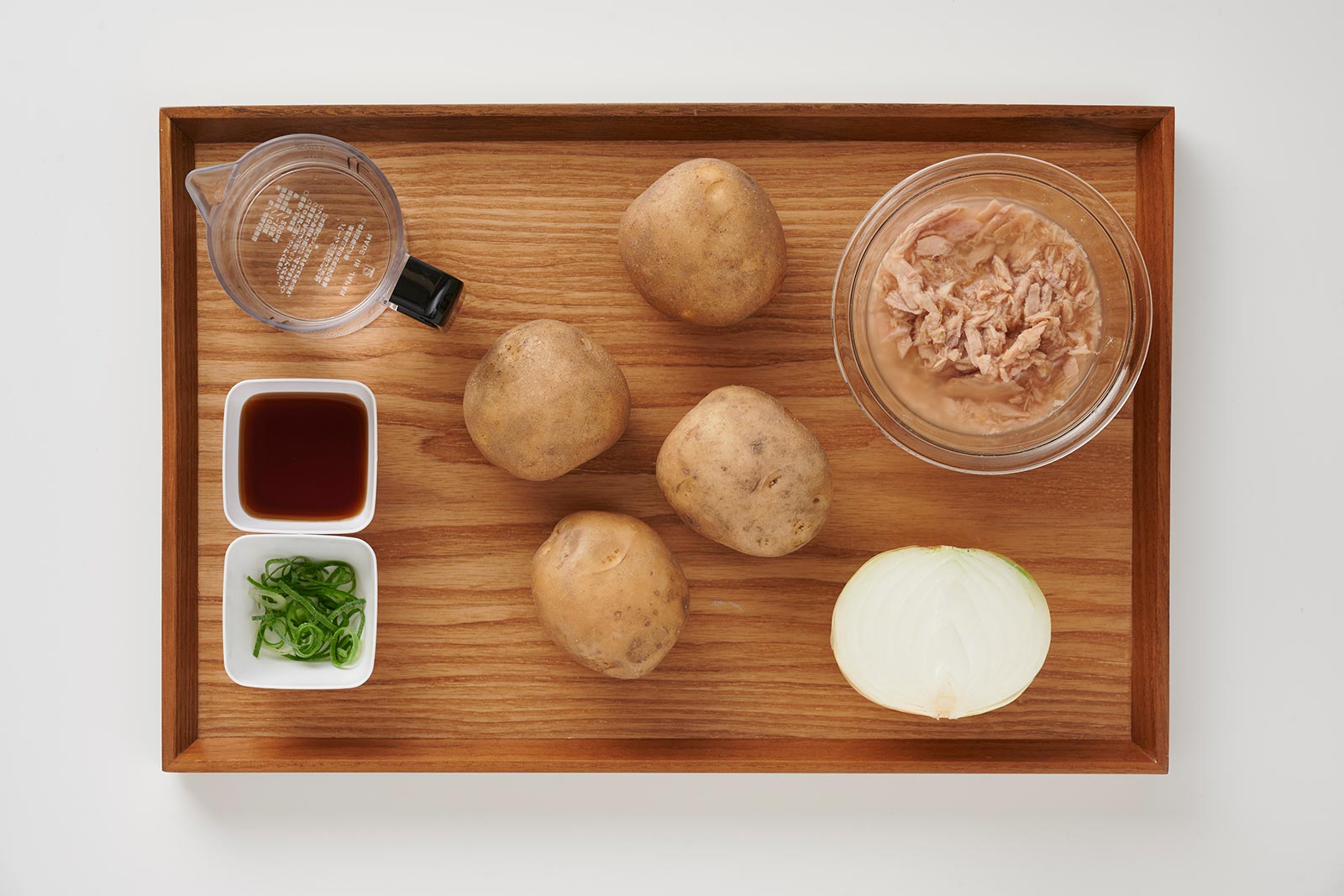 ①耐熱容器に、皮をむいて8等分にしたじゃがいも、皮をむいて薄切りにした玉ねぎ、ツナ(汁ごと)、水を入れる。ふんわりラップをかけて、電子レンジで10分加熱し、軽く混ぜてさらに5分加熱する。