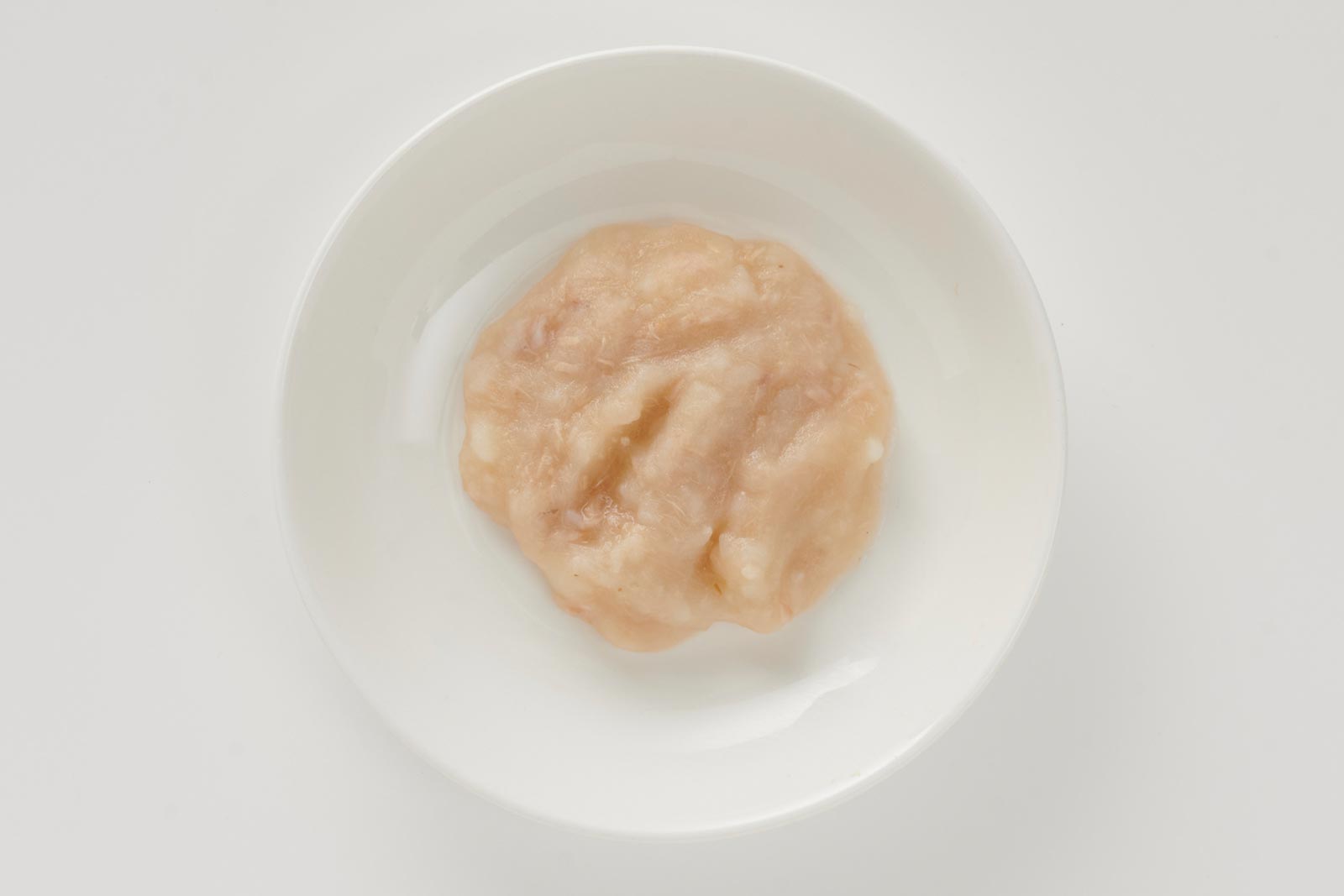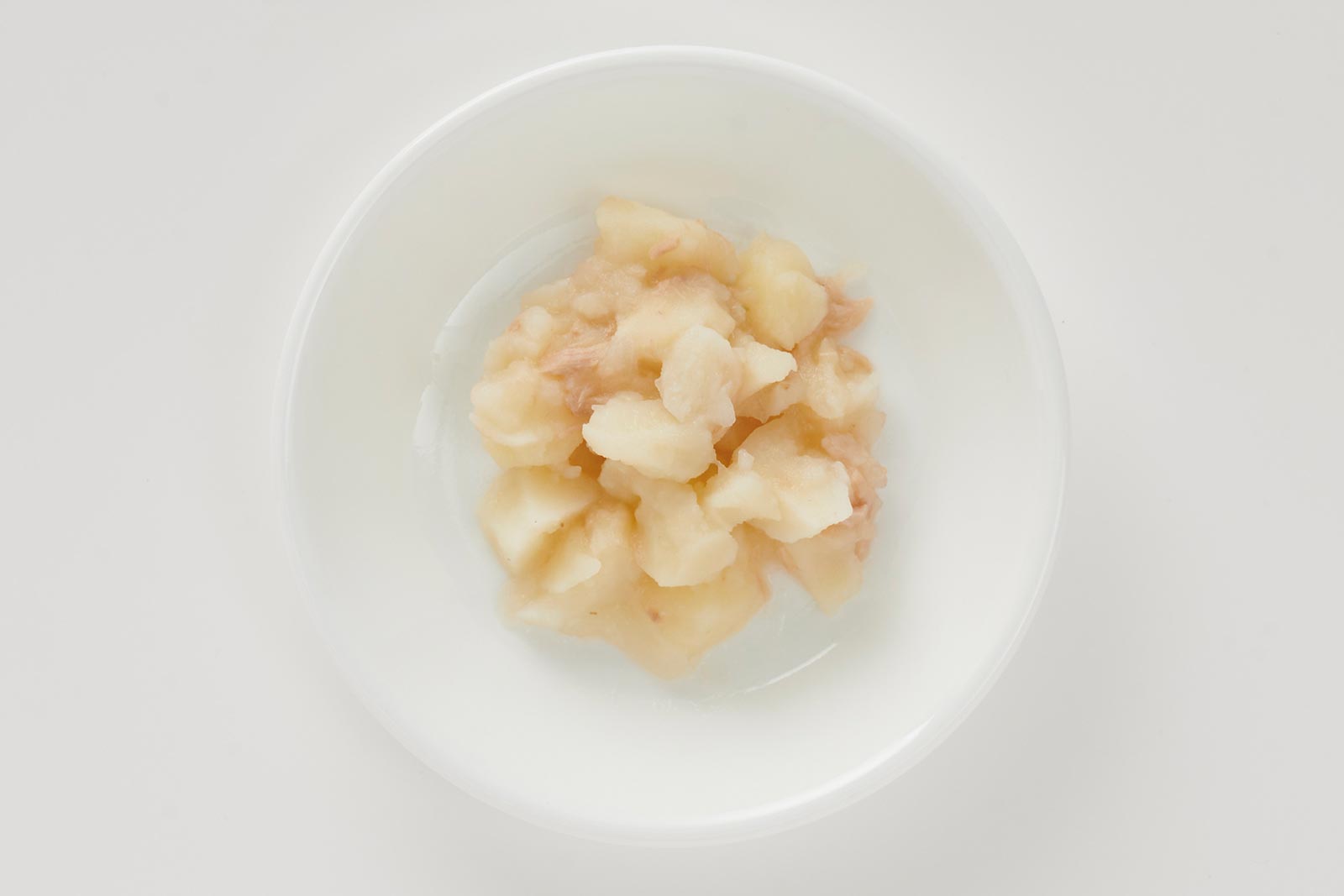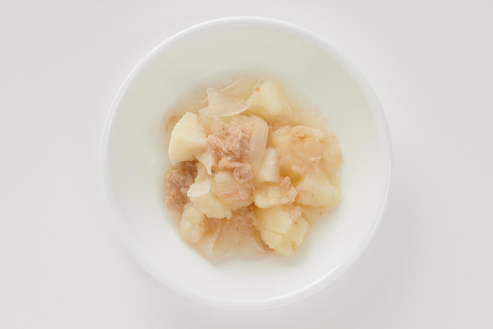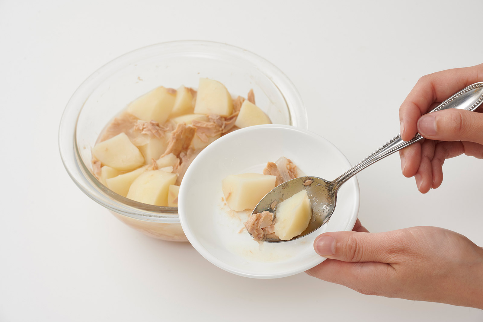 じゃがいも、玉ねぎ、ツナ(合わせて30g)に、だし汁(大さじ1)を加えてつぶす。