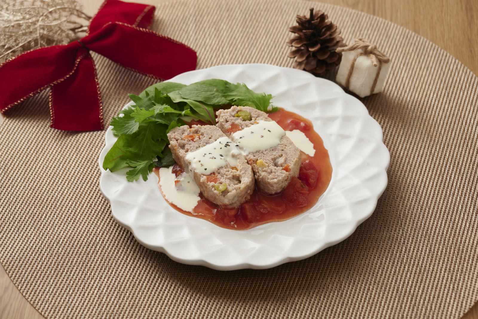 ⑤ミートローフを食べやすい大きさに切り、皿にカットトマト、ミートローフの順に盛りつけ、(④)をかけ、お好みで粗びきこしょうをふる。