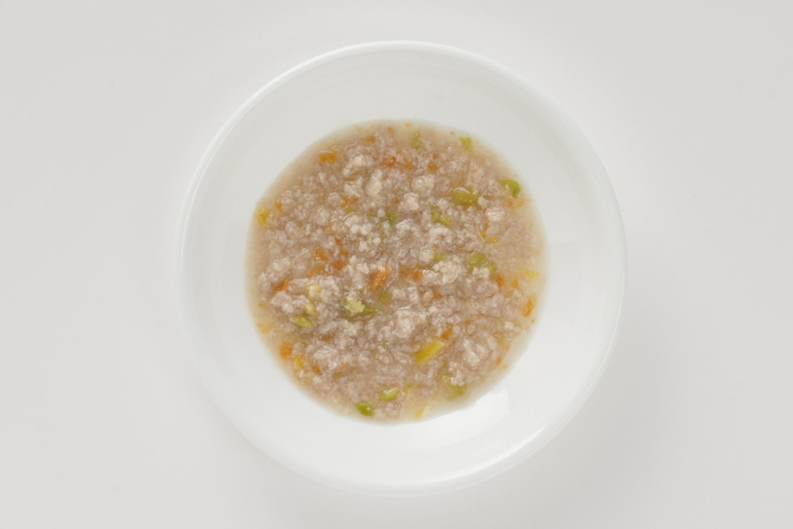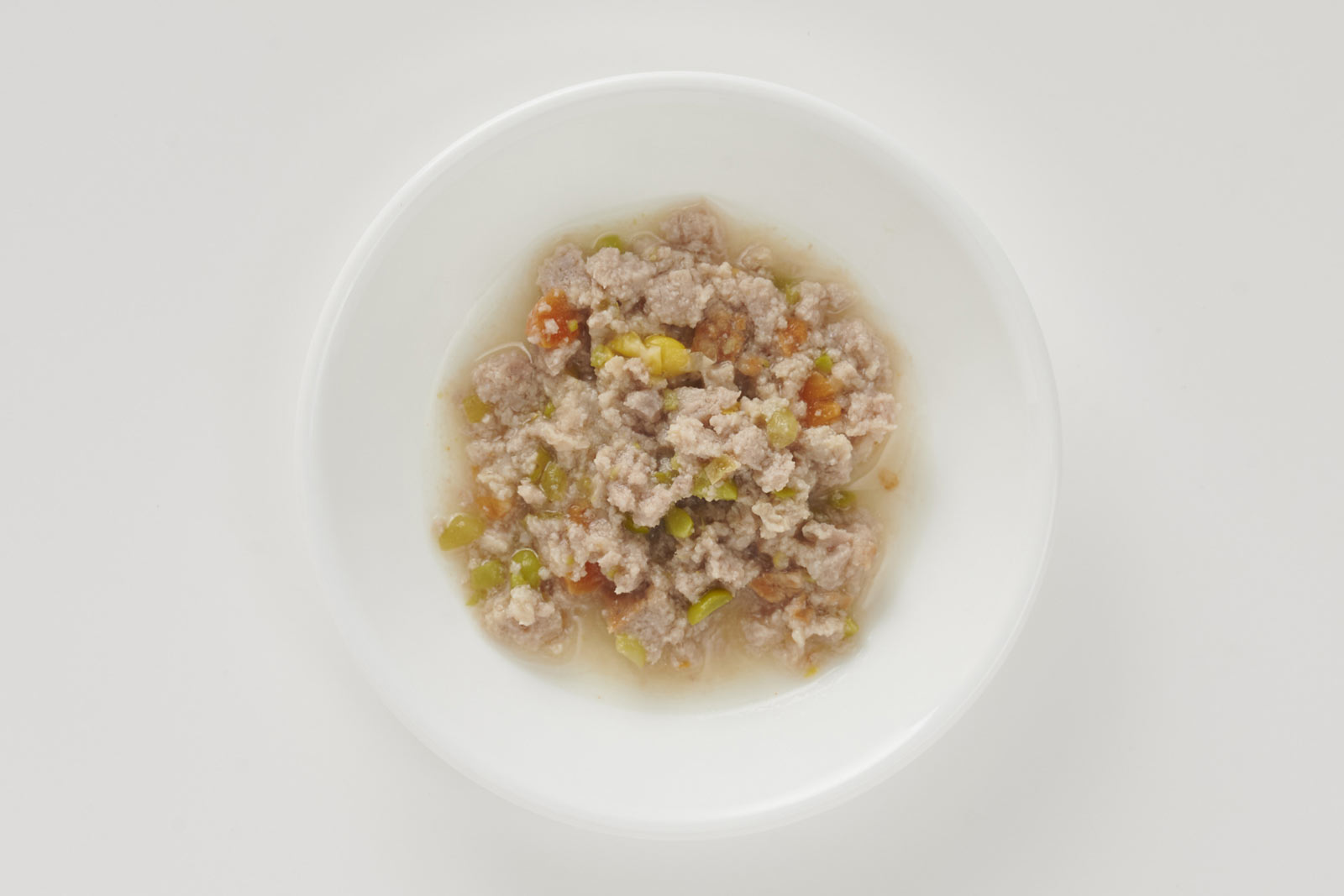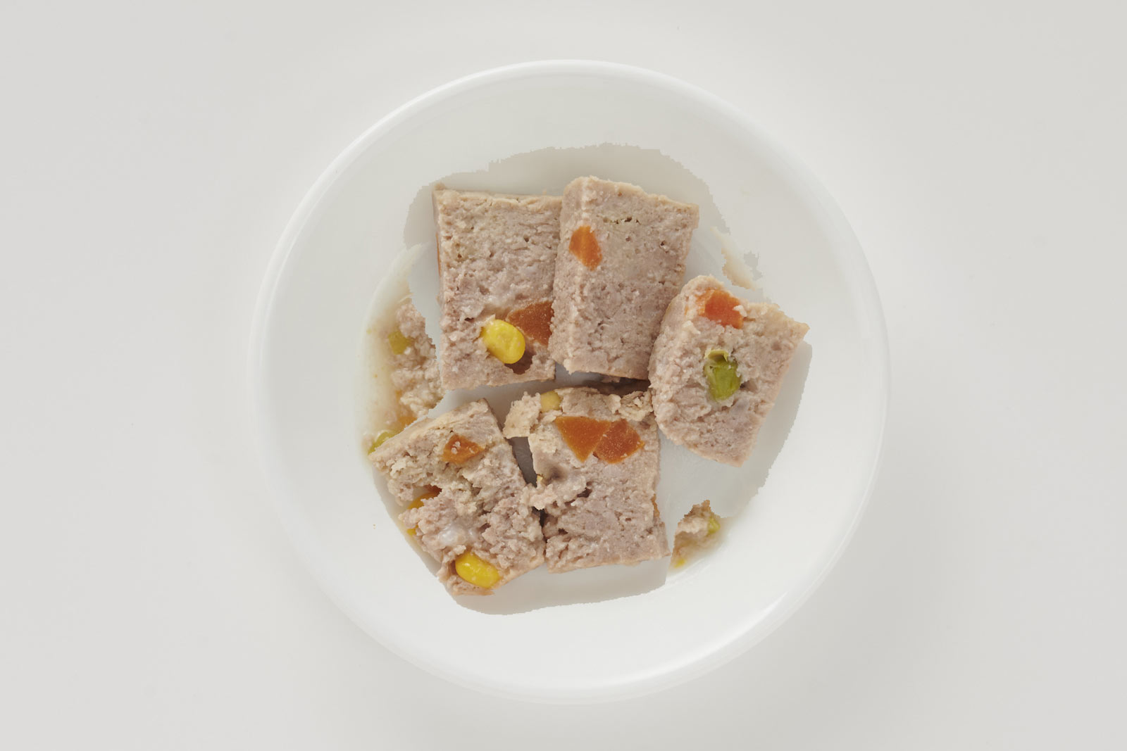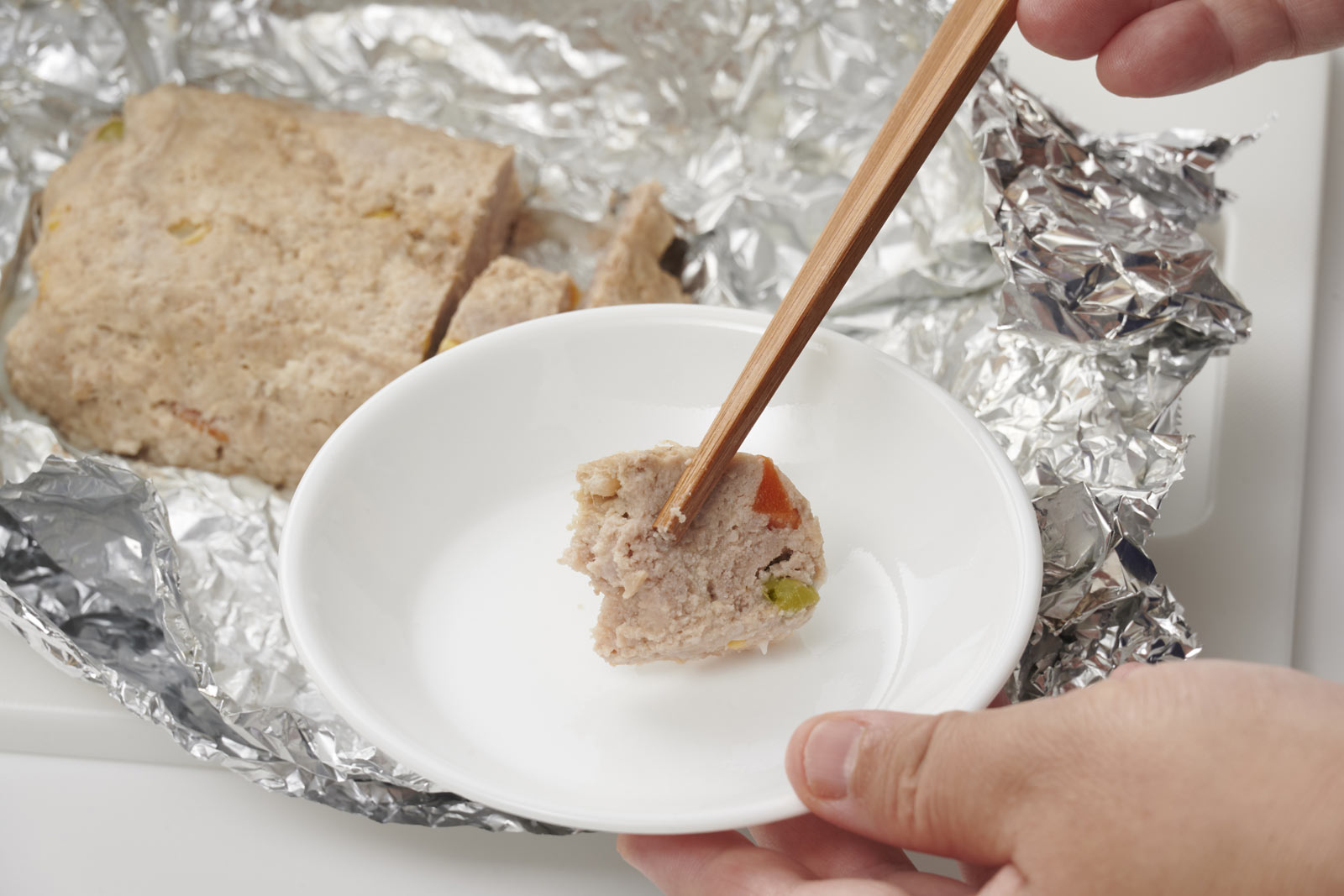 耐熱容器に、粗みじん切りにしたミートローフ(20g)と水(大さじ2)を入れて、ラップをかけて、電子レンジで20秒加熱する。
