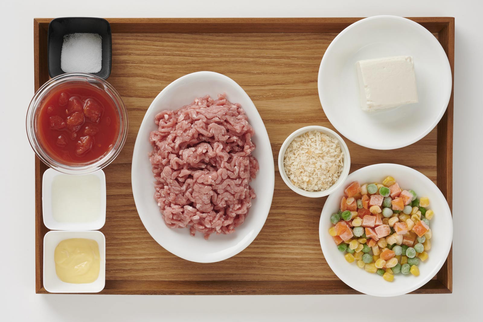 耐熱容器に、みじん切りにしたミートローフ(15g)、水(大さじ2)、片栗粉(小さじ1/2)を入れて、ラップをかけて、電子レンジで20秒加熱する。よく混ぜて再度20秒加熱する。