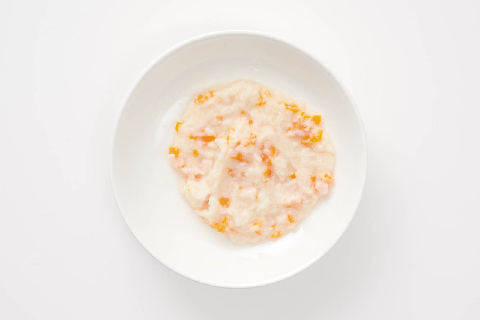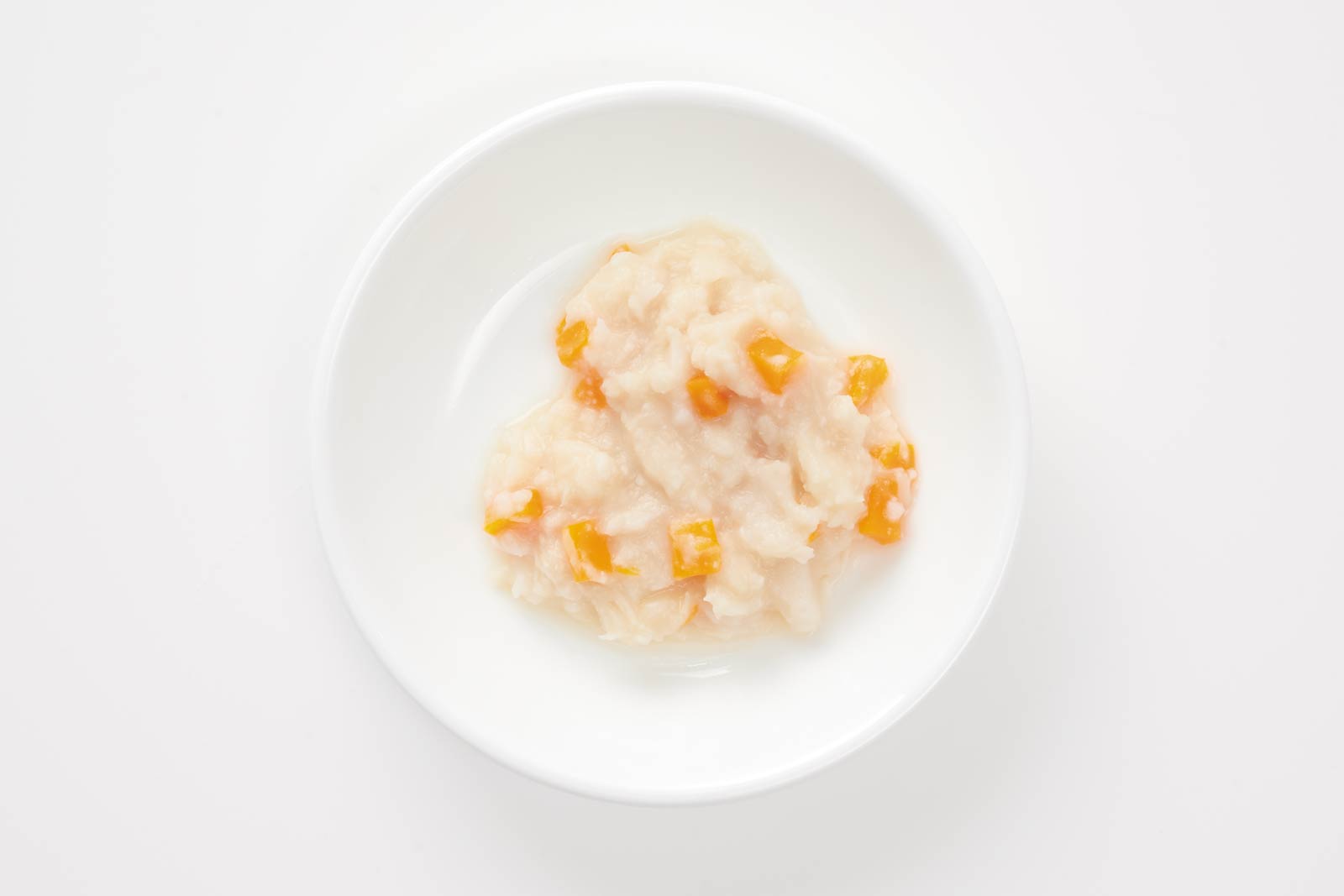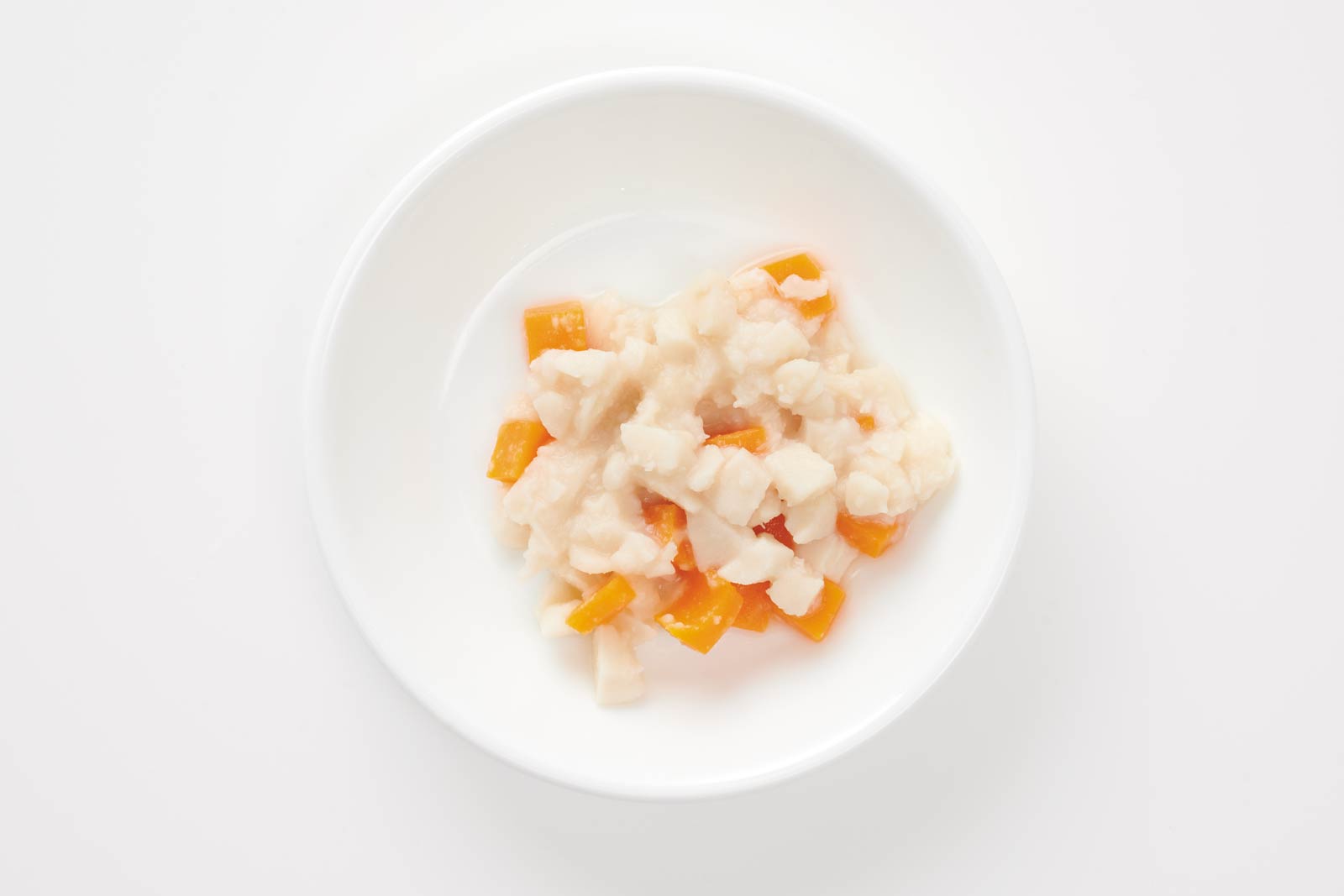 里いも(1切れ)を粗くつぶし、にんじん(1枚)を細かく切る。煮汁(大さじ1)をかける。