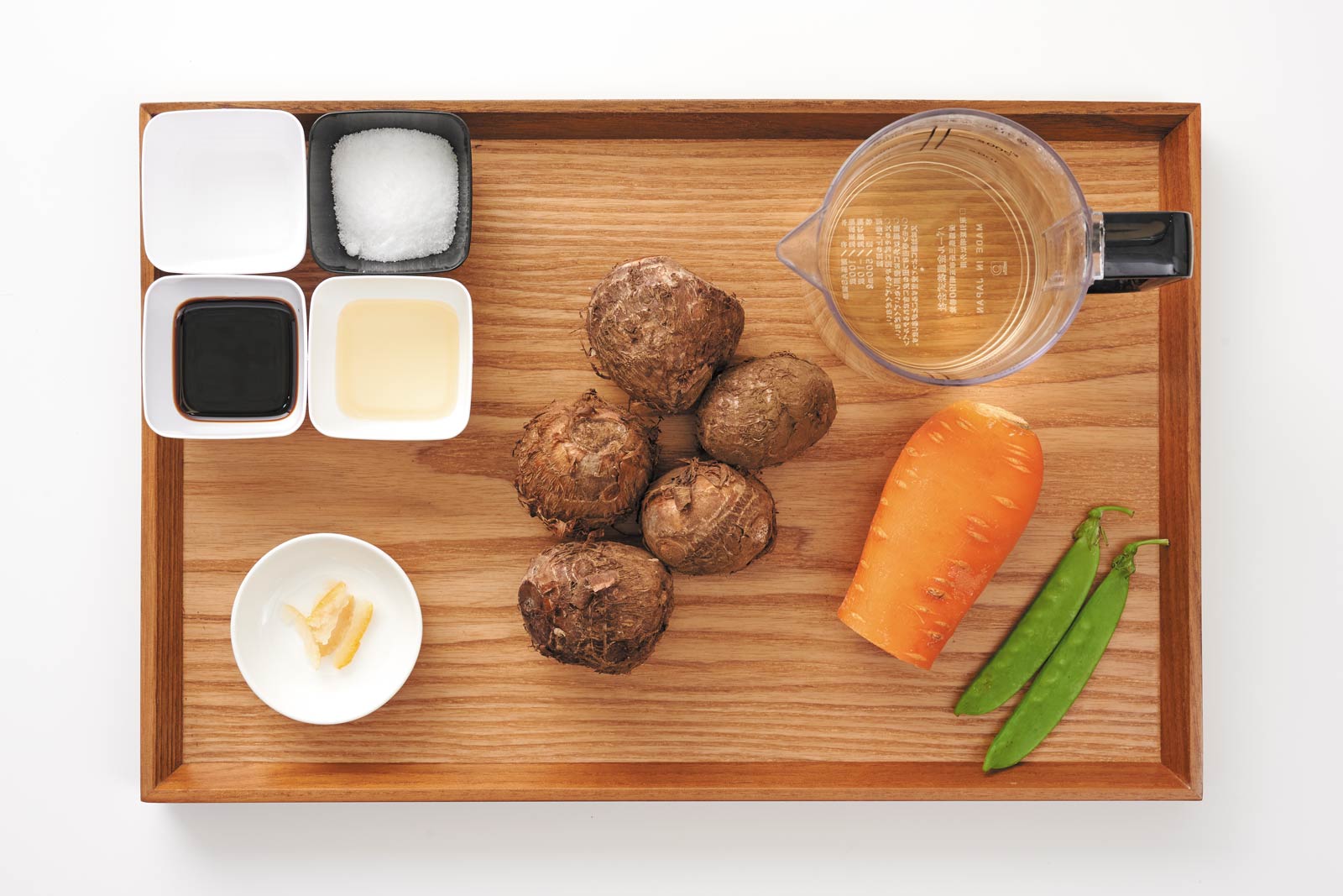 ①里いもは洗って水けをふく。両端を切り落とし、切り口が六角形になるように縦に皮をむいて2等分し、4分程度ゆでて表面のぬめりを洗う。にんじんは花型で抜く。