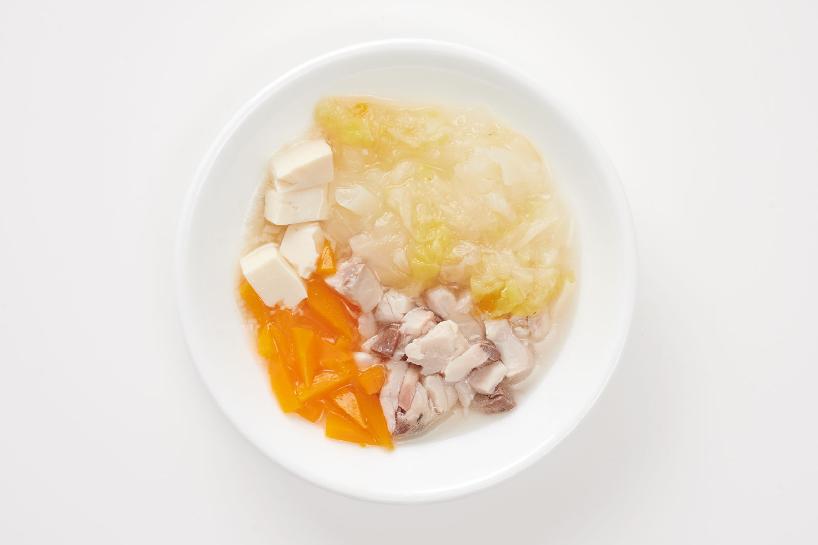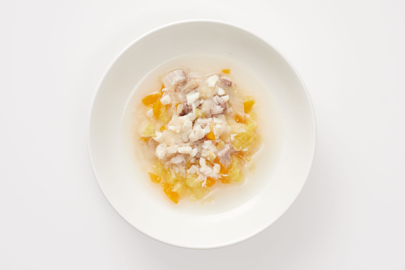 耐熱容器に、粗みじん切りにしたぶり(10g)と野菜(豆腐含めて・大さじ1)、だし汁(大さじ1)を入れる。ふんわりラップをかけて、電子レンジで20秒加熱する。