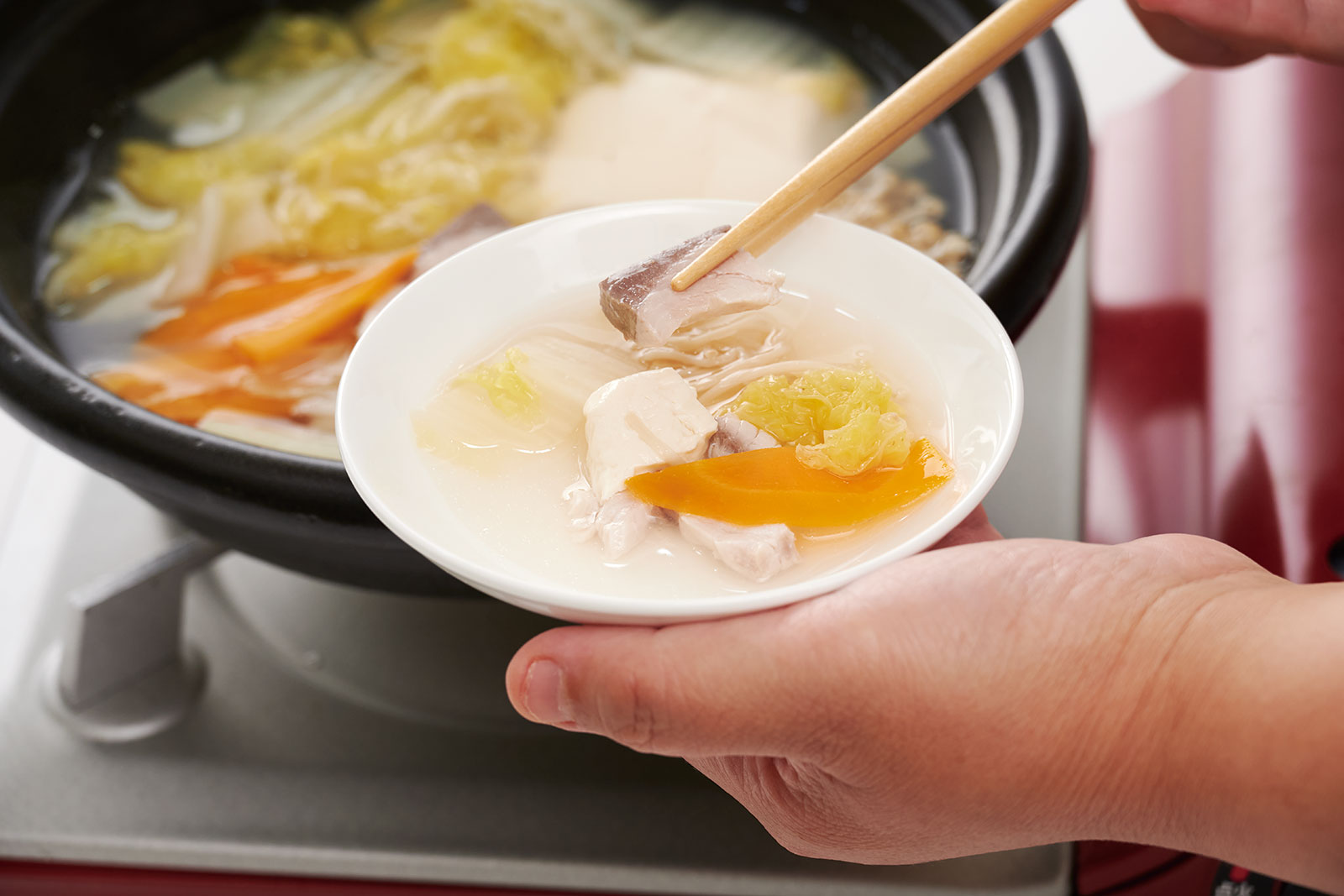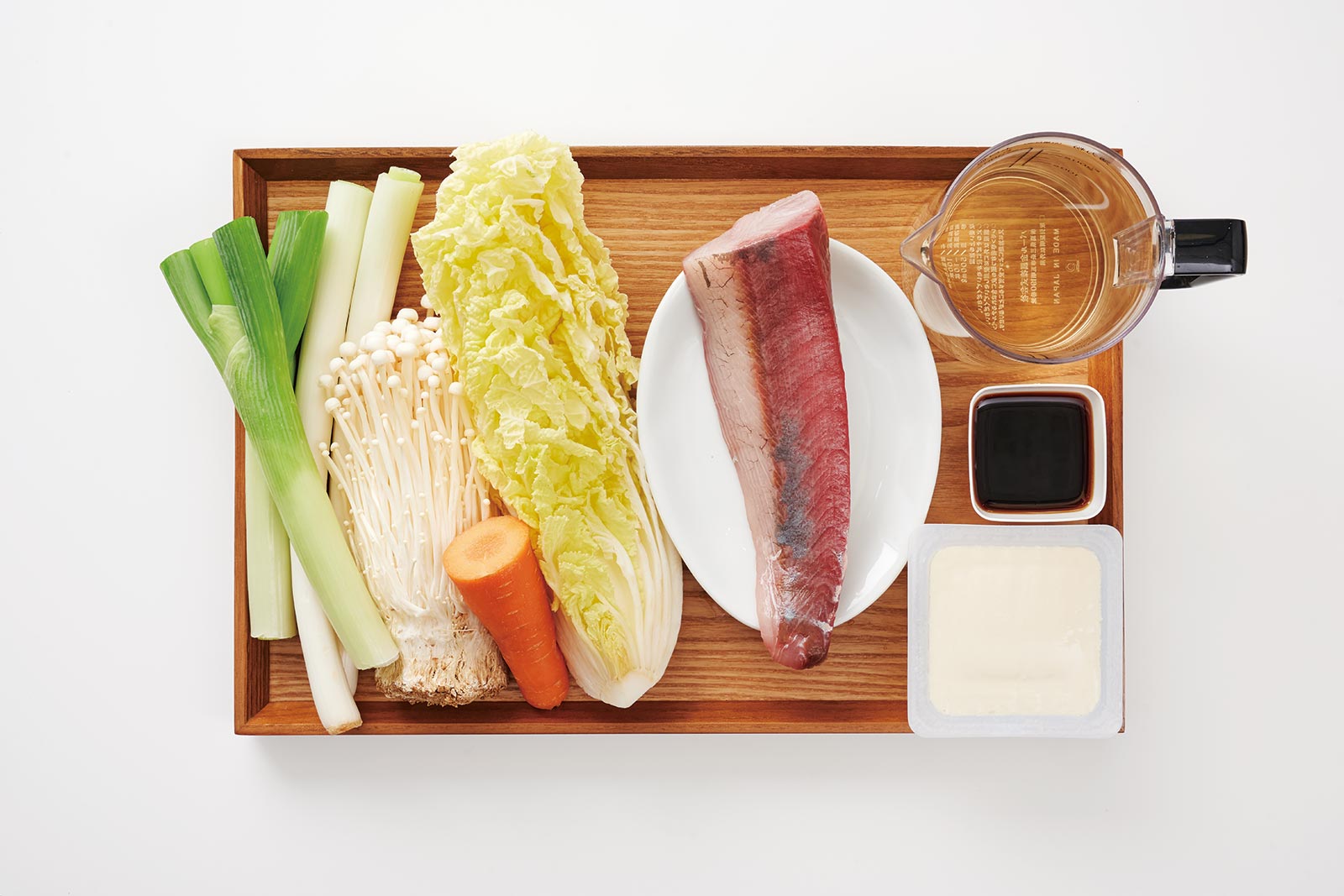 ①ぶりは薄切り、白菜、にんじん、長ねぎ、豆腐は食べやすい大きさに、えのきは根元を切ってほぐす。