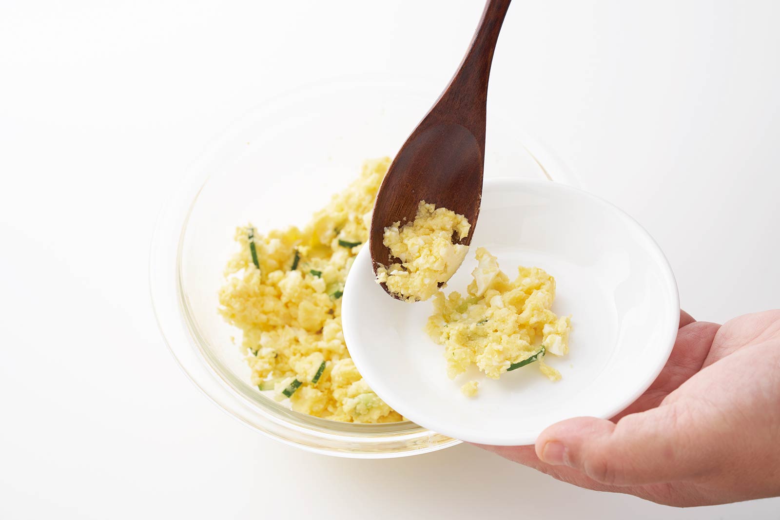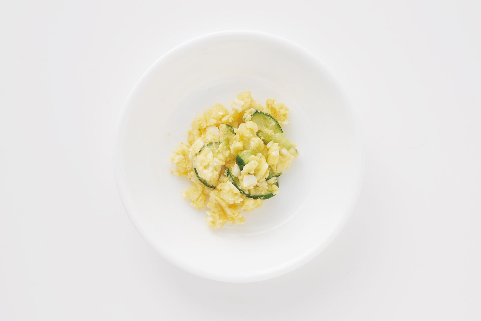 ③じゃがいもとゆで卵をフォークでつぶす。あら熱がとれたら、きゅうりとヨーグルトを加えて混ぜ合わせる。